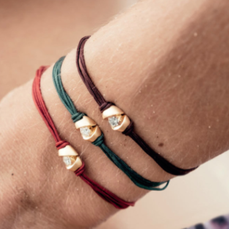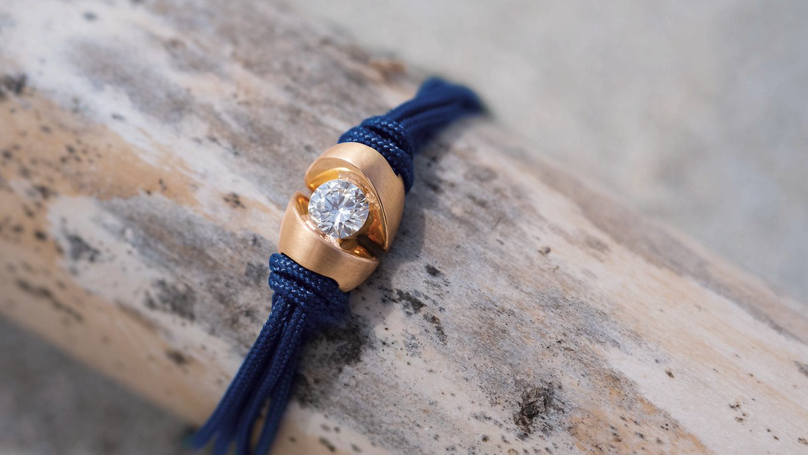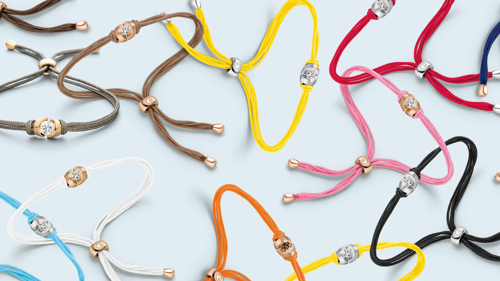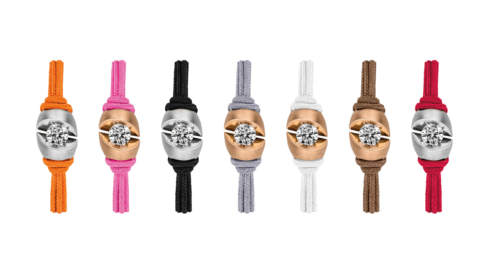 Glitzernde Solitaire-Diamanten liegen fast schwebend in einem schützenden Bett aus Gelbgold, Rosé- oder Weißgold. Die fein gedrehten Textilarmbänder kommen in allen Farben des Lebens und lassen sich dank der innovativen Schließe easy übers Handgelenk streifen und fixieren. Ob zum Anzug, zum Boho-Kleid oder zur Jeans: Ein Colortaire ist ein Statement zu jedem Outfit.