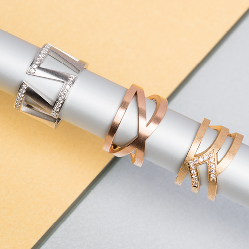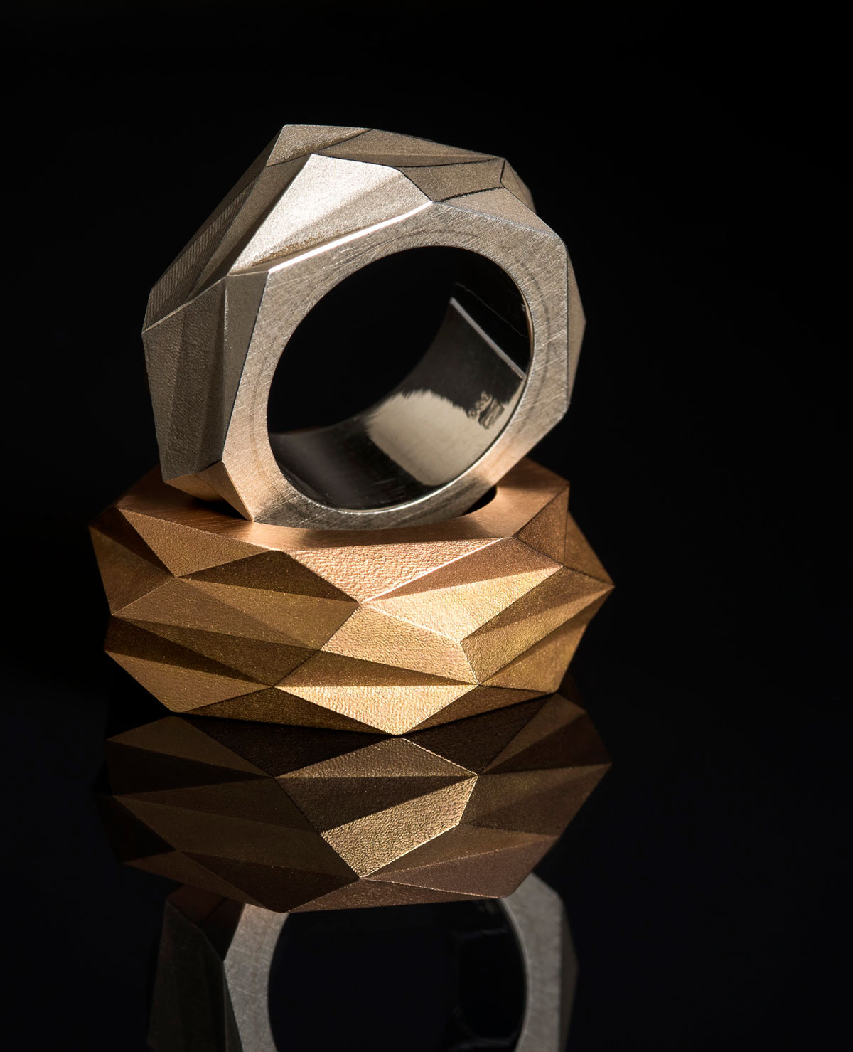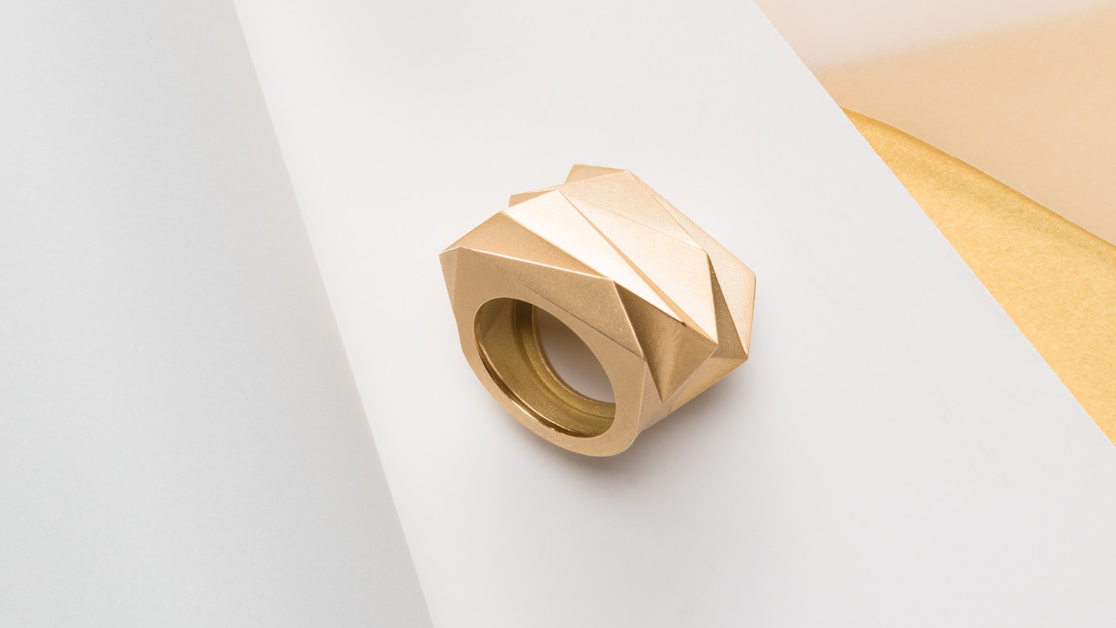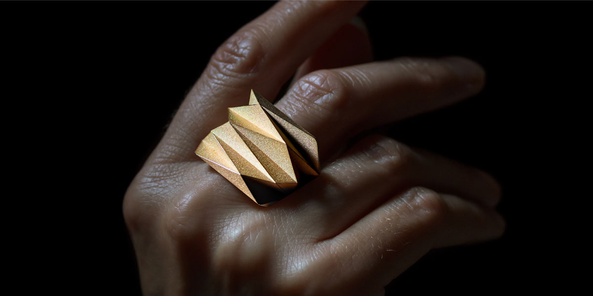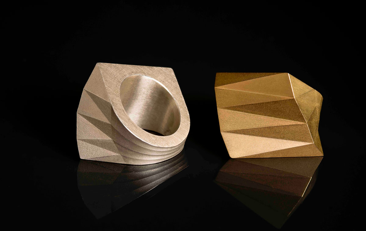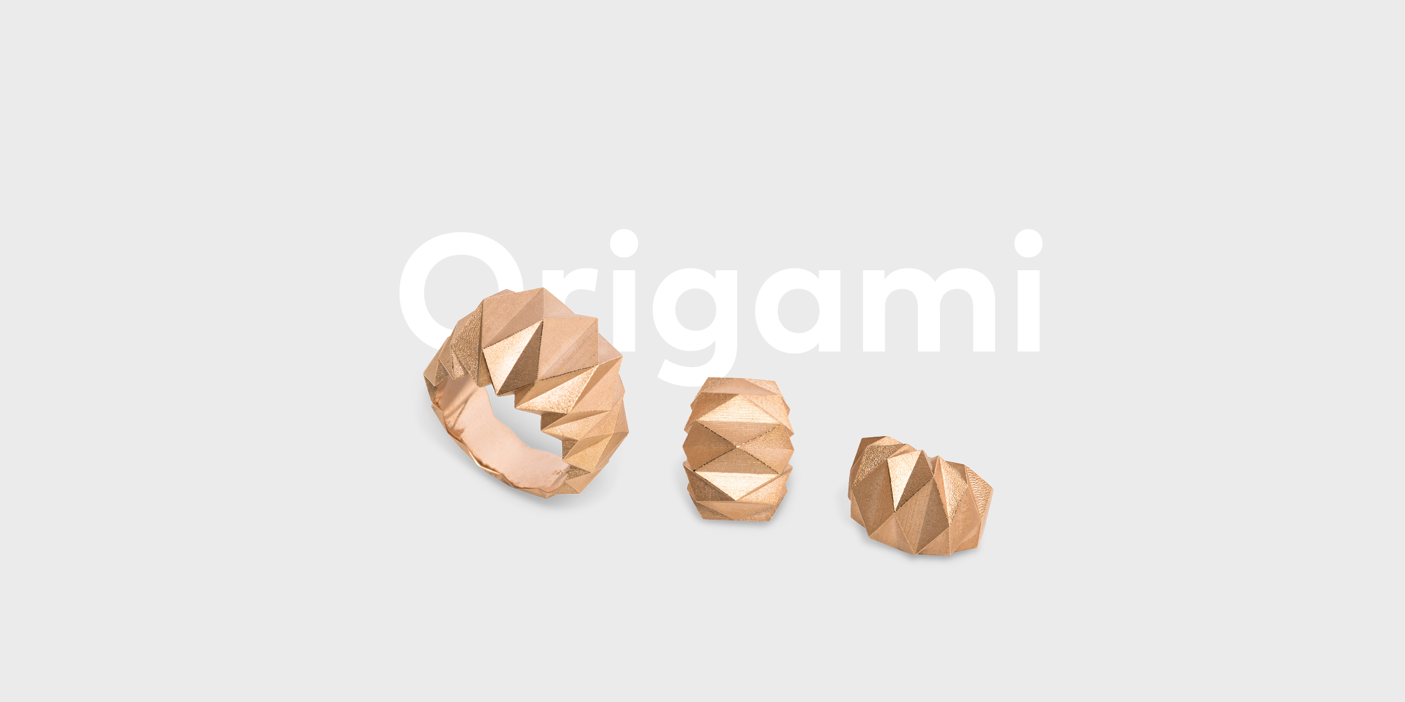 Das Ergebnis: Eine ausdrucksstarke und individuelle Schmuckkollektion, im Stile der Papierfaltung, gefertigt in 750/- Gold sowie Sterling Silber.