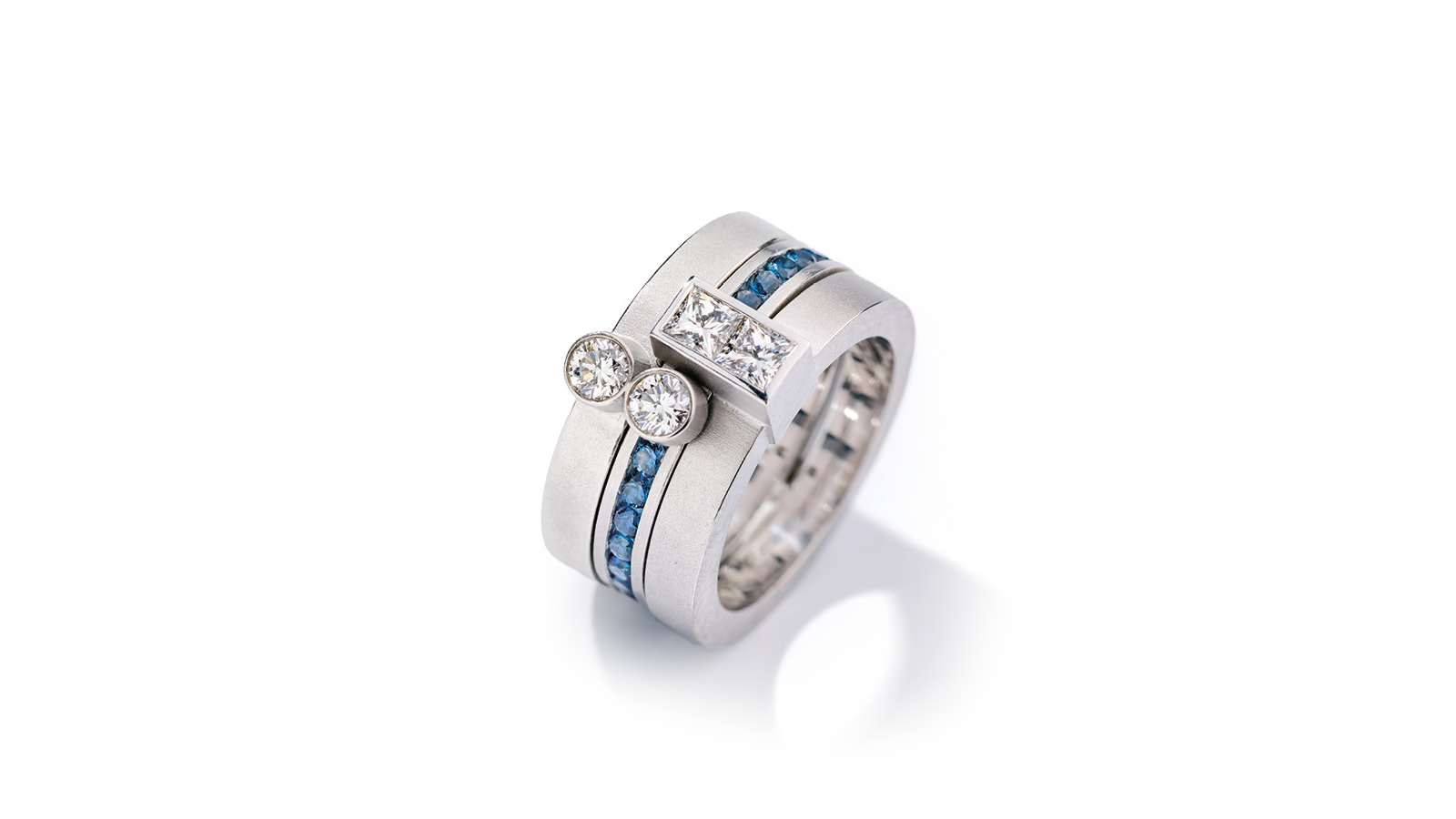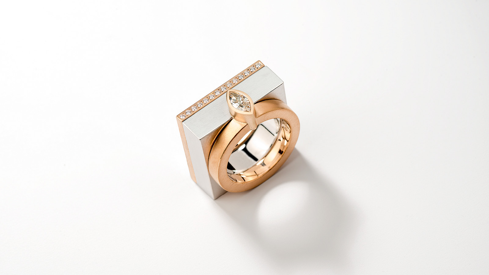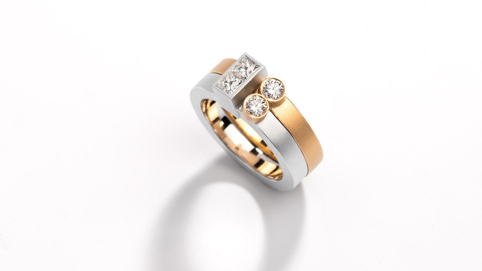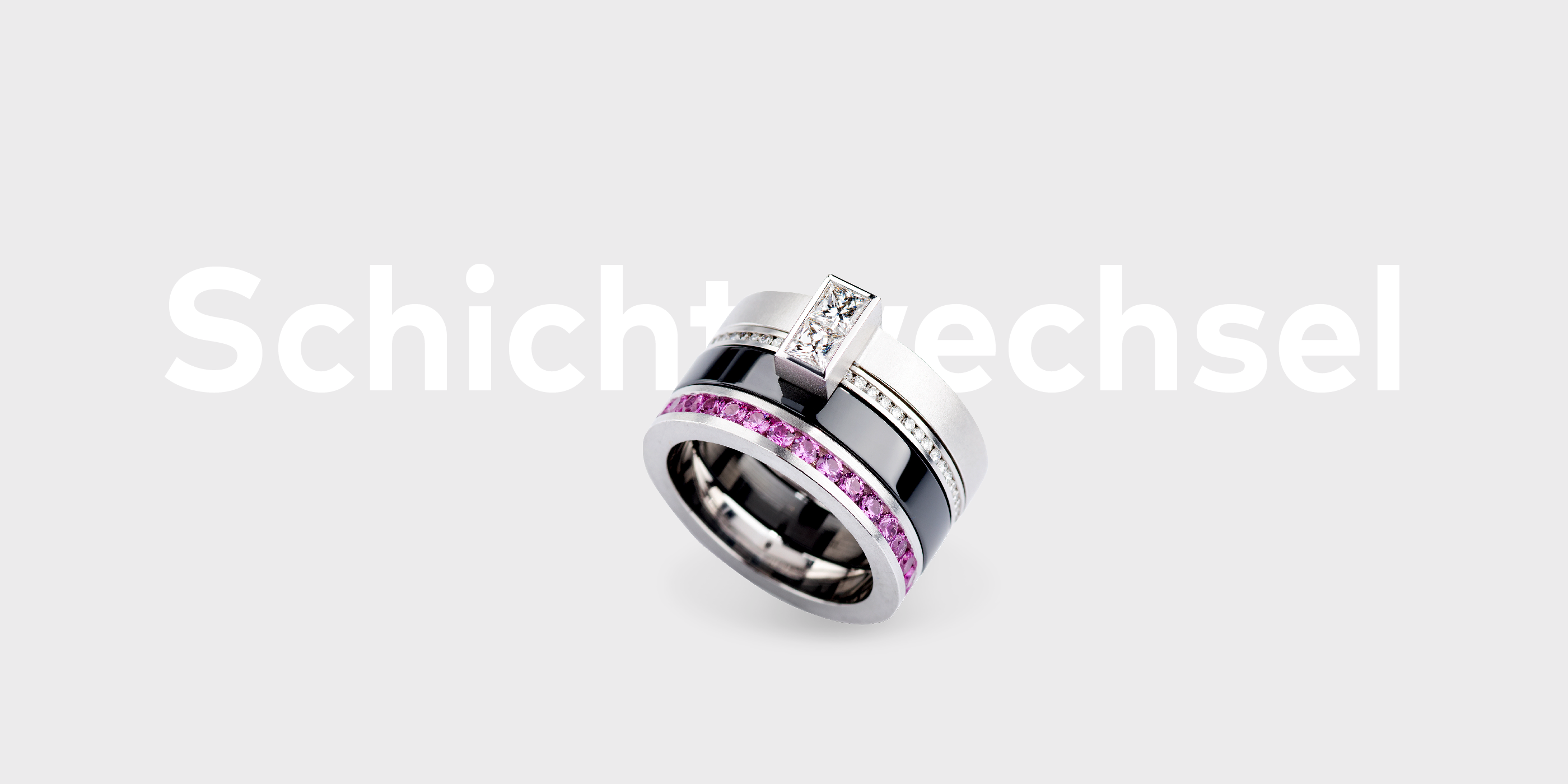 Ein einzigartiges, vielfältig kombinierbares Ringsystem, exklusiv entwickelt und hergestellt von Juwelier Zimmer. Schichtwechsel bietet Ihnen die Möglichkeit, Ihr ganz persönliches Schmuckstück aus bis zu drei Ringen zu kreieren, je nach Wunsch aus den Kollektionen Quadrat, Kreis, Halbrund, Schichtsegment und/oder Freiform.