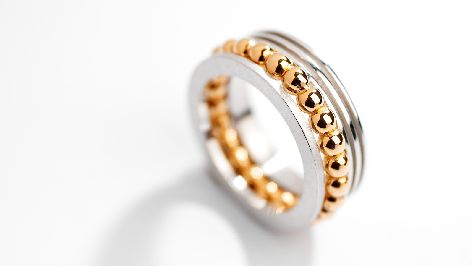 Über 30 unterschiedliche Ringformen, gefertigt in 750/- Gelb-, Weiß-, und Rotgold können unter- und miteinander kombiniert werden.